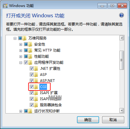 控制面板→程序和功能→打开或关闭Windows功能,在打开的窗口中依次展开Internet信息服务→万维网服务→应用程序开发功能→勾选CGI选项即可,相关截图如下所示: