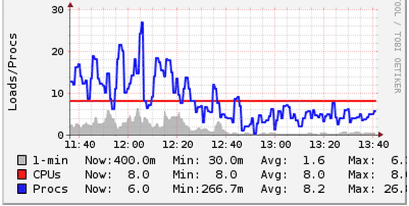 请注意上图,看系统负荷(蓝线)是如何降到CPU核数(红线)以下的。在其它服务器上,我们也看到了同样的情况。既然总的工作量保持不变,那么上图中的性能改善只能归功于上下文切换的减少。 |