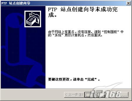 第十步:完成FTP站点的全部设置工作。当然如果建立过程中存在这样或那样问题的话会在设置向导的最后给出详细的提示信息,有效的帮助我们排除故障。(如图19)